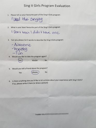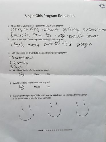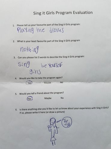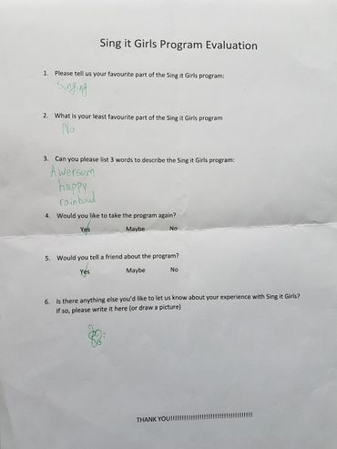 Thank you for taking the time to review some of the evaluations the participants of Sing it Girls have completed.